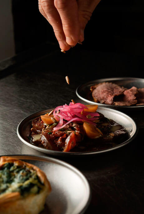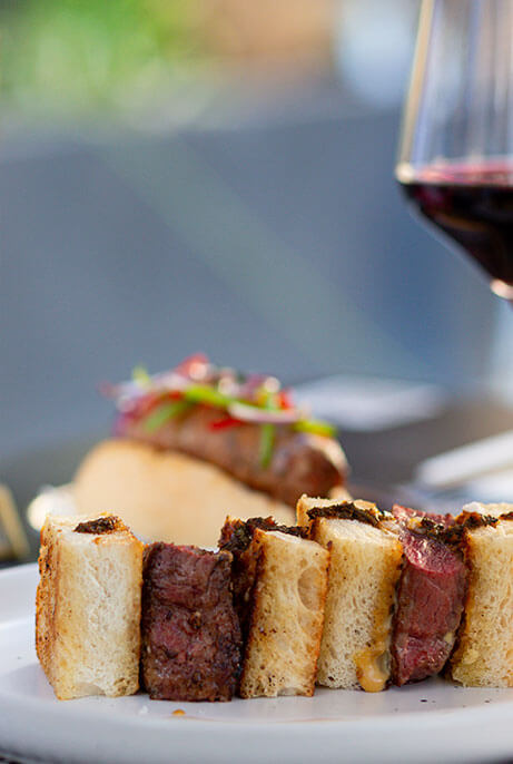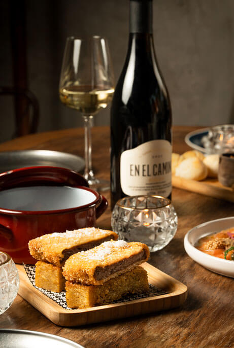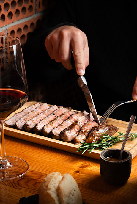 Por la noche, nuestra propuesta gira en torno a las carnes argentinas de pastura y las milanesas, acompañadas por una recorrida por sabores de distintas regiones de Argentina, desde el norte al sur.